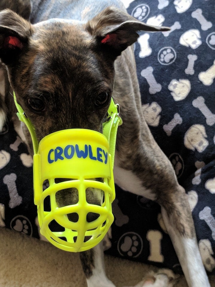 Mr. Crowley looking handsome in his new muzzle adorned with one of our Muzzle Decals.